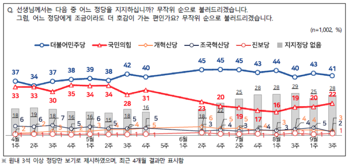 민주당 지지도 41%, 국민의힘 22%...조국혁신당 성비위 후폭풍으로 5%→2% 급락