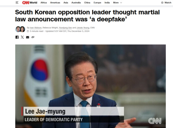 이 대표는 이날 미국 CNN 방송과의 인터뷰에서도 지난 3일 밤 계엄 소식을 처음 들었을 때 '딥페이크'(허위 영상물)로 생각했다고 말했다.