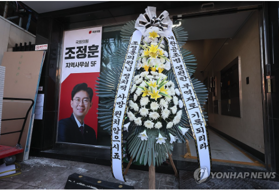| ▲ 서울 마포구 국민의힘 조정훈 의원의 지역구 사무실 앞에 탄핵 표결 불참을 비난하는 근조화환이 배달돼 있다. 2024.12.10 (사진=연합뉴스) |