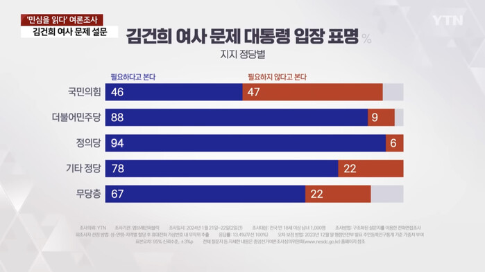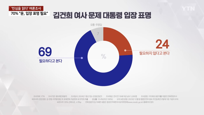 YTN 의뢰로 여론조사업체 '엠브레인퍼블릭'이 21~22일 이틀간 전국 성인 1천명을 대상으로 윤석열 대통령이 부인 김건희 여사와 관련한 문제들에 직접 입장을 밝혀야 하는지 물은 결과 69%가 "윤 대통령의 입장 표명이 필요하다"고 답했다.