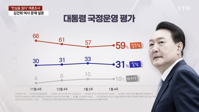 24일 YTN은 이 같은 결과를 공개하며 '김건희 특검법' 찬성 여론이 60% 안팎이었던 점을 감안할 때 윤 대통령의 행태에 민심이 더욱 악화된 것으로 풀이된다고 보도했다.