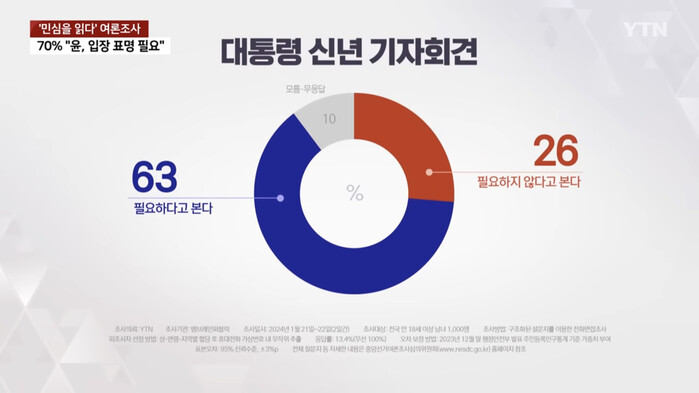 윤 대통령이 지난해 거른 신년기자회견을 올해는 해야 하는지에 대해서도 63%가 "필요하다"고 답했고, "필요하지 않다"는 26%에 그쳤다.