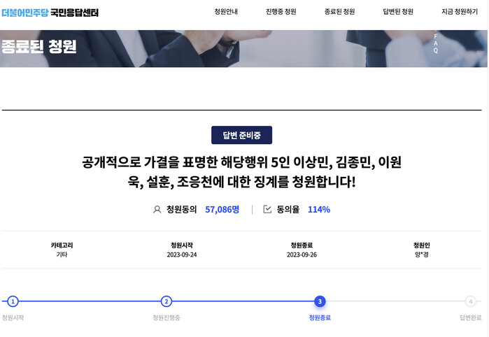 지난달 24일 민주당 국민응답센터에는 "공개적으로 가결을 표명한 해당행위 5인 이상민, 김종민, 이원욱, 설훈, 조응천에 대한 징계를 청원합니다!"라는 청원글이 올라왔고 이는 청원동의 57086명, 동의율 114%로 청원이 종료됐다.