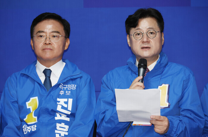 | ▲홍익표 원내대표가 진교훈 서울 강서구청장 후보와 함께 있다 (사진=연합뉴스) |