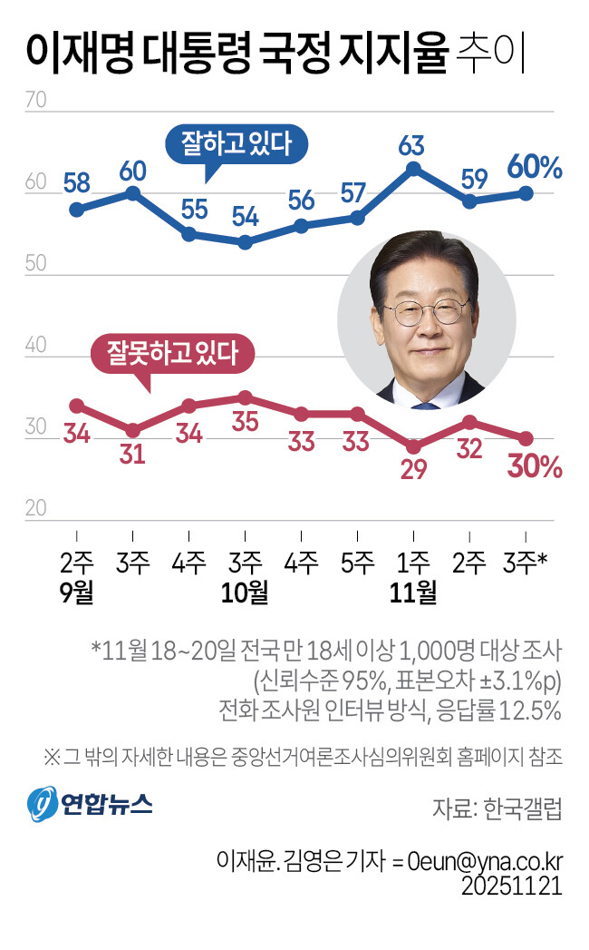 한국갤럽이 18~20일 전국 만 18세 이상 1,000명을 대상으로 조사한 결과 응답자의 60%가 이 대통령이 ‘잘하고 있다’고 답했고, ‘잘못하고 있다’는 응답은 30%, 의견 유보는 10%였다.