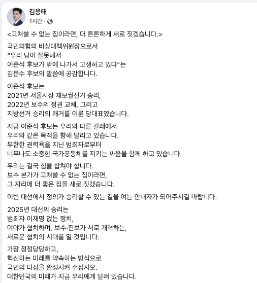 그는 “이 후보는 무한한 권력욕을 지닌 범죄자로부터 너무나도 소중한 국가공동체를 지키는 싸움을 함께 하고 있다”며 “우리는 결국 힘을 합쳐야 한다”고 말했다. 그는 그러면서 “보수 본가가 고쳐쓸 수 없는 집이라면 그 자리에 더 좋은 집을 새로 짓겠다”라며 “이번 대선에서 정의가 승리할 수 있는 길을 여는 안내자가 되어주시길 바란다”고 적었다. 국민의힘이 개혁신당과 당을 합치면서 당을 새로 만들 수도 있다는 뜻으로 해석된다.