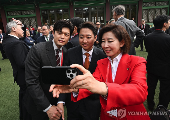 | ▲ 국민의힘 김용태 비대위원장과 나경원이 개혁신당 이준석 후보와 휴대폰 사진을 찍고 있다. 2025.5.21 (사진=연합뉴스) |