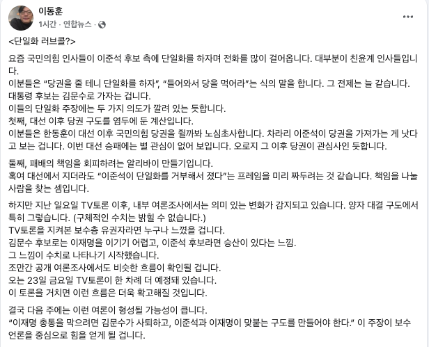 그는 이어 “이분들은 한동훈이 대선 이후 당권을 쥘까봐 차라리 이준석이 당권을 가져가는 게 낫다고 보는 것”이라며 “대선 승패에는 별 관심이 없어 보이고 오로지 당권이 관심사인 듯 하다”고 분석했다.