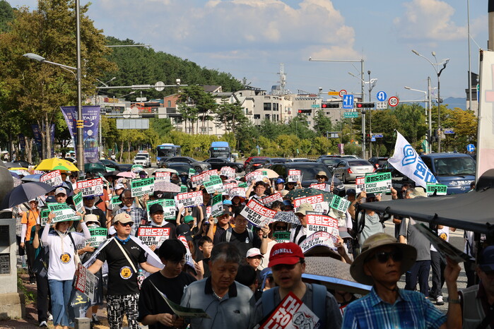 이들은 이날 오후 3시께 홍범도 장군 기념표지판이 있는 대전 유성구 도시철도 1호선 현충원역 앞에 모여 국립대전현충원까지 이어지는 4km를 걸으며 "흉상 이전을 철회하라"라고 반복해서 외쳤다.