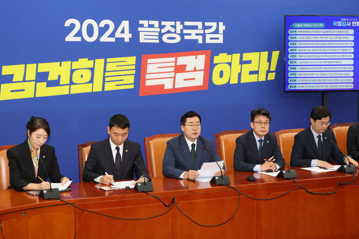 박찬대 원내대표는 국회에서 열린 국감대책회의에서 김 여사를 둘러싼 각종 의혹을 언급하며 "검찰에 수사 의지가 없다는 점이 확인된 만큼 민주당은 '김건희 특검'과 상설특검, 국정감사로 실체적 진실을 밝혀내겠다"고 말했다.