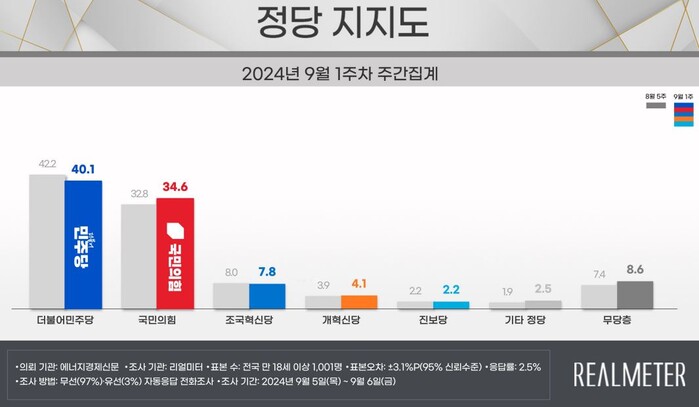 지난 5∼6일 전국 18세 이상 유권자 1천1명을 대상으로 이뤄진 정당 지지도 조사(95% 신뢰수준에 표본오차 ±3.1%p)는 국민의힘이 34.6%, 더불어민주당이 40.1%를 기록했다.