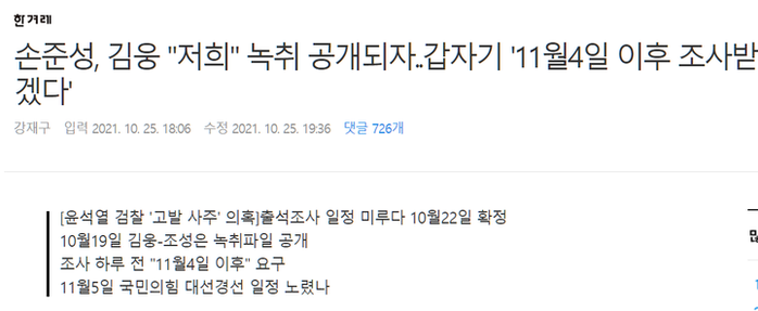 한겨레 보도에 따르면 손 검사와 김웅 국민의힘 의원은 고발 사주와 관련한 자신들의 조사 일자를 돌연 11월 4일 이후로 못박았다. 11월 5일은 국힘 대선 후보가 선출되는 날이다. 이들이 대선 경선 일정을 노린 것으로 윤 전 총장의 대선 후보 선출 여부에 따라 어떤 진술을 내놓을까 주목되는 시점이다.
