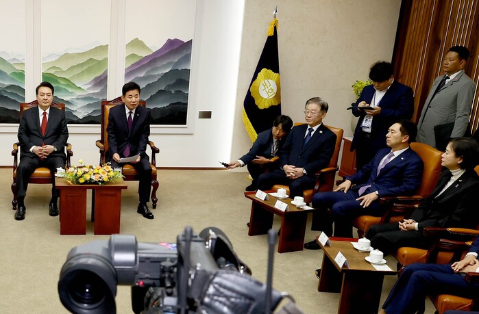 예산안을 설명하기 위해 국회를 찾은 윤석열 대통령이 시정연설전, 사전 환담자리에서 이재명 더불어민주당 대표를 만났다.