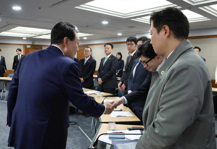 | ▲한 장관과 인사하는 윤 대통령 (사진=연합뉴스) |