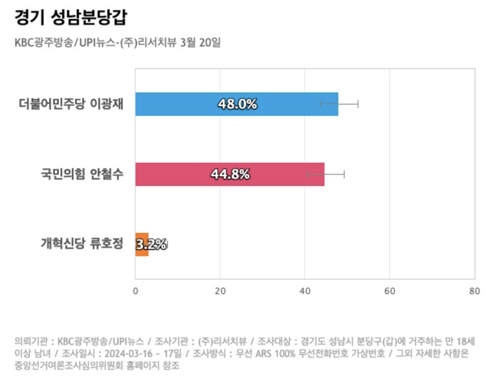 4.10 총선 경기 성남분당갑 지역구 여론조사 결과 더불어민주당 이광재 후보 48%, 국민의힘 안철수 후보 44.8%, 개혁신당 류호정 후보 3.2%로 집계됐다.