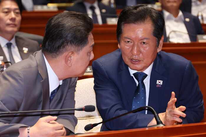| ▲ 더불어민주당 정청래 대표(오른쪽)와 김병기 원내대표가 27일 서울 여의도 국회에서 열린 의원총회에서 대화하고 있다. 2025.8.27 (사진=연합뉴스) |