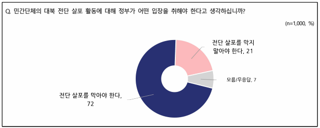 대북 전단 살포에 대해선 ‘접경지역 주민의 안전을 위해 전단 살포를 막아야 한다’가 72%, ‘표현의 자유를 보장하는 차원에서 전단 살포를 막지 말아야 한다’는 21%로 나타났다.