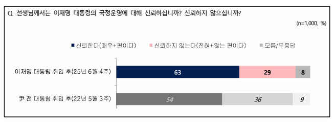 이 대통령의 국정운영에 대해선 ‘신뢰한다’(매우+신뢰함)는 응답은 63%, ‘신뢰하지 않는다’ (전혀+신뢰하지 않음)는 응답은 29%로 나왔다.