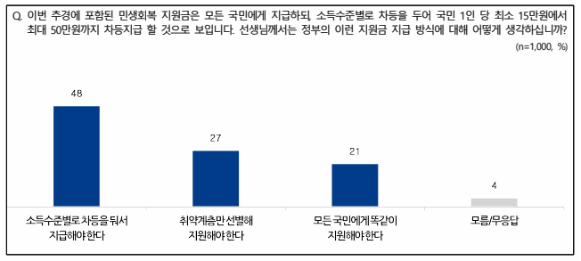 민생회복지원금 지급방식에 대해선 ‘소득수준별로 차등을 줘서 지급해야 한다’ 48%, ‘취약계층만 선별해 지원해야 한다’ 27%, ‘모든 국민에게 똑같이 지원해야 한다’ 21%의 순으로 나왔다.