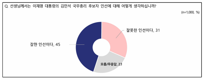 김민석 국무총리 후보자 인선에 대해선 ‘잘한 인선이다’는 45%, ‘잘못한 인선이다’는 31%로 나왔다.