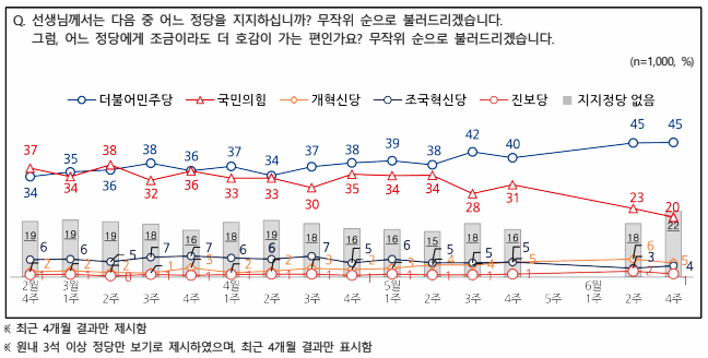 정당지지도는 ‘더불어민주당’ 45%, ‘국민의힘’ 20%, ‘개혁신당’ 5%, ‘조국혁신당’ 4%, ‘진보당’ 1% 등의 순으로 나타났다. ‘태도유보’(없다+모름/무응답)는 23%였다.