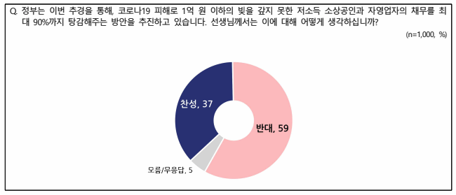 코로나19 피해로 인한 소상공인 및 자영업자 채무 탕감에 대해서는 ‘불가피하게 늘어난 채무를 국가가 함께 책임지겠다는 취지에서 찬성한다’가 37%, ‘도덕적 해이나 성실히 빚을 갚은 사람들과의 형평성 문제가 있어 반대한다’는 59%로 나왔다.