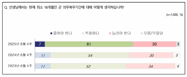 현행 군복무 기간에 대해선 ‘적정하다’는 응답이 61%로 과반인 가운데, ‘늘려야 한다’는 응답은 30%, ‘줄여야 한다’ 7%로 나타났다.
