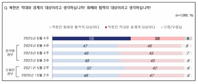 북한에 대해선 ‘화해와 협력의 대상’이라는 인식이 56%, ‘적대와 경계의 대상’이라는 인식은 38%로 나왔다. 모름/무응답은 6%였다.