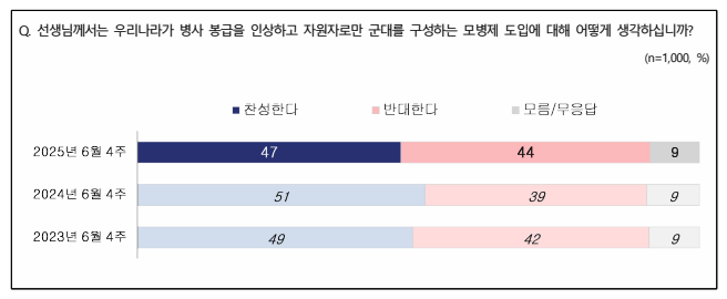 모병제 도입에 대해 ‘찬성한다’는 응답이 47%로 ‘반대한다’ 44%로 찬반이 팽팽했다.