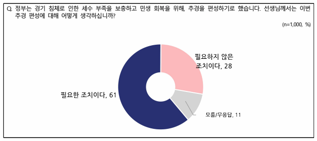 추경 편성에 대해서는 ‘필요한 조치이다’가 61%, ‘필요하지 않은 조치이다’는 28%로 나타났다.