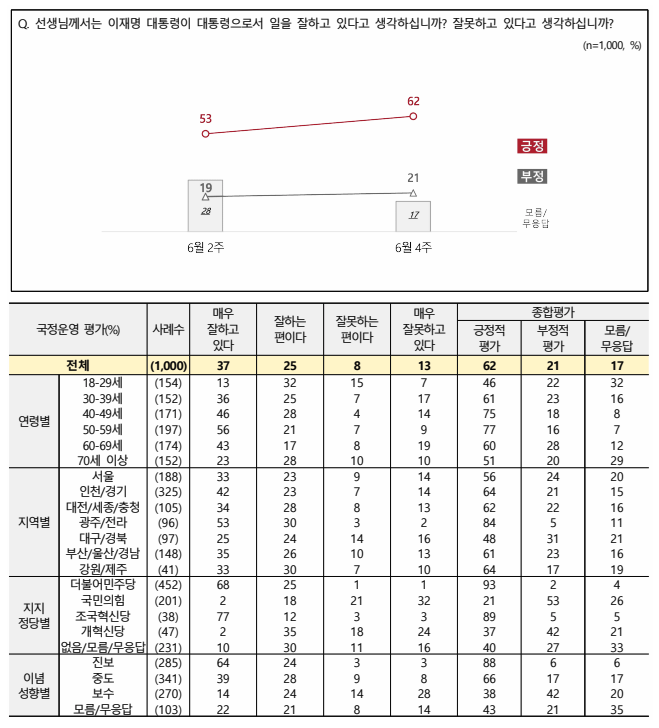 ‘잘못하고 있다’(매우+못함)라는 부정적 평가는 21%, 모름/무응답은 17%였다.