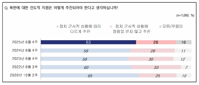 북한에 대한 인도적 지원에 대해서는 ‘정치 군사적 상황에 따라 다르게 추진되어야 한다’가 63%, ‘정치 군사적 상황에 영향을 받지 않고 추진되어야 한다’는 26%로 나타났다.