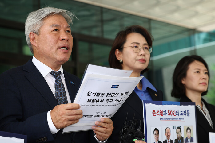 | ▲ 조국혁신당 서왕진 원내대표(왼쪽)가 22일 내란 특검 사무실이 있는 서울고등검찰청에서 엄정수사를 촉구하는 기자회견을 열고 발언하고 있다. 2025.7.22 (사진=연합뉴스) |
