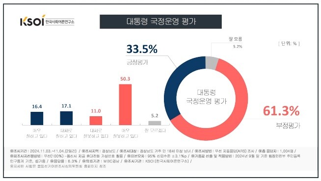 여론조사전문업체 한국사회여론연구소(KSOI)는 MBC경남의 의뢰로 만 18세 이상 경남도민을 대상으로 지난 3~4일 여론조사 결과, 대통령 국정운영 평가에 대해 '잘하고 있다'는 응답이 33.5%, '잘못하고 있다'는 응답이 61.3%로 나타났다(잘 모르겠다 5.2%)라고 밝혔다.