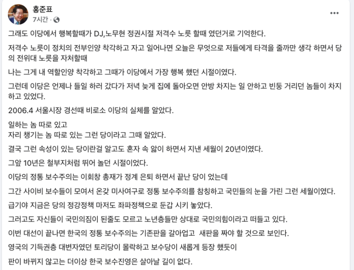 홍 전 시장은 이날 페이스북에 "그래도 이 당에서 행복할 때가 DJ, 노무현 정권 시절 저격수 노릇 할 때였던 것으로 기억한다"라며 "저격수 노릇이 정치의 전부인 양 착각하고, 자고 일어나면 '오늘은 무엇으로 저들에게 타격을 줄까'만 생각하면서 당의 전위대 노릇을 자처할 때"라고 회고했다.
