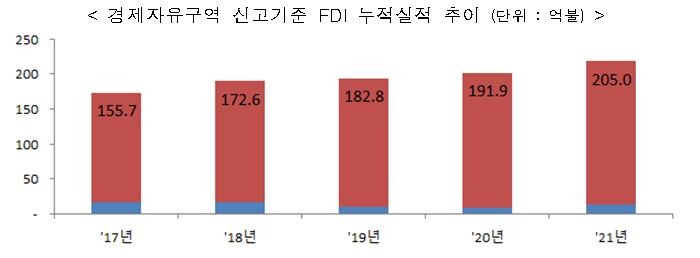 산업통상자원부(장관 문승욱, 이하 산업부)는 2021년 "경제자유구역 외국인직접투자(FDI)"가 신고기준으로 전년 대비 42.8% 증가한 13.1억불, 도착기준으로는 126% 증가한 8.4억불을 기록하여 최근 3년래 최고 실적을 기록하였으며, 2003년 경제자유구역 제도 도입 이후 누적기준으로 205억불을 달성하였다고 밝혔다.