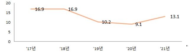 | ▲ 최근 5년간 경제자유구역 신고기준 FDI 실적 추이 (단위 : 억불) |