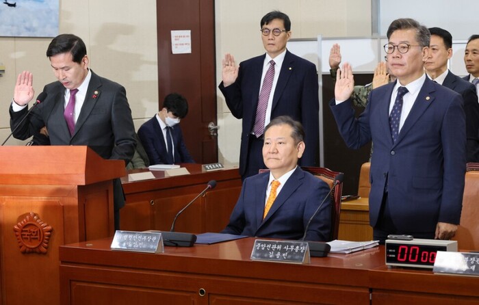 이 전 장관은 1차 청문회 때 처럼 이날도 증인 선서를 거부했다. 이 전 장관은 “집중적으로 수사를 받기 때문에 선서와 증언을 거부했다”고 했다.