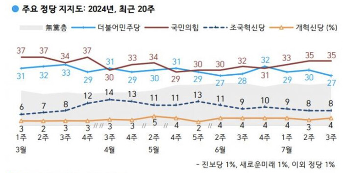 정당 지지도는 국민의힘 35%, 더불어민주당 27%, 조국혁신당 8%, 개혁신당 4%, 진보당 1%, 기타 정당 1%로 나타났다. 지지하는 정당이 없는 무당층은 23%였다.