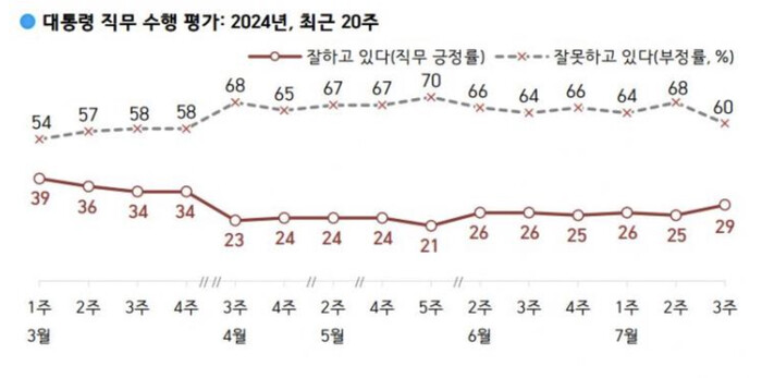 부정 평가율은 60%로, 직전 조사보다 8%p 하락했다.