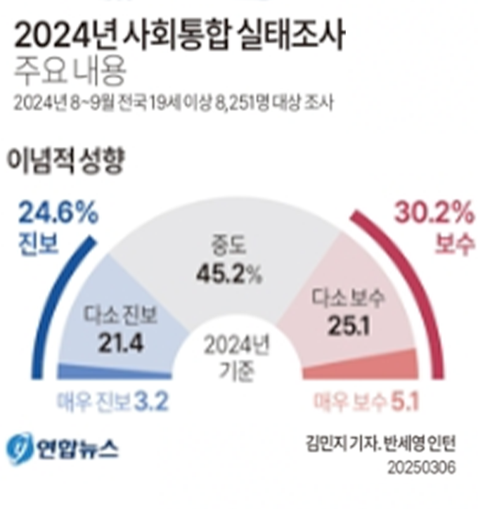 "내 이념은" 보수 30.2%, 진보 24.6%, 중도 45.2%