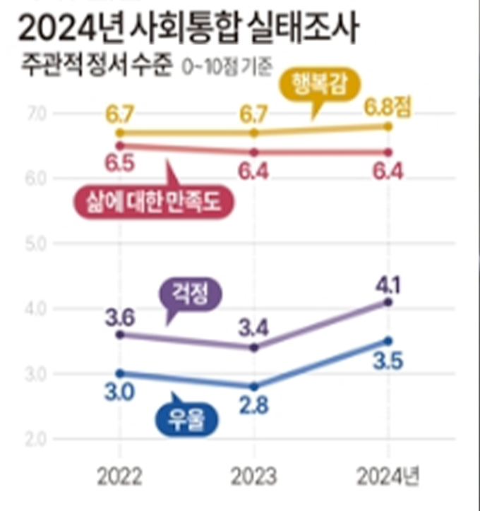 반면, 부정적 정서에 해당하는 걱정은 3.4점에서 4.1점으로, 우울은 2.8점에서 3.5점으로 크게 올랐다.