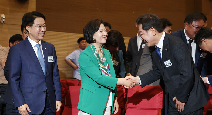 | ▲조정식 추미애 당선자와 인사 나누는 이재명 대표 (사진=연합뉴스) |
