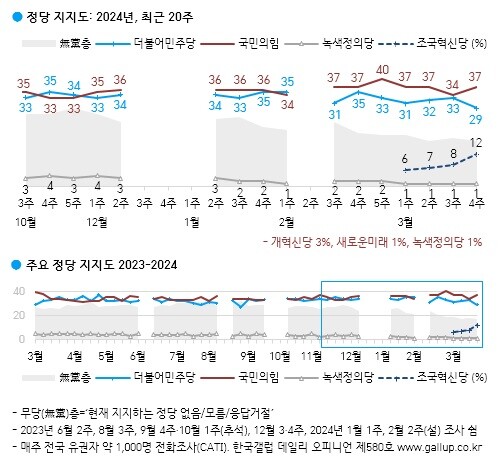 한국갤럽은 "민주당 지지도가 하락한 만큼, 조국혁신당 지지도가 상승해 범야권 내에서 오고 간 모양새"라고 분석했다.