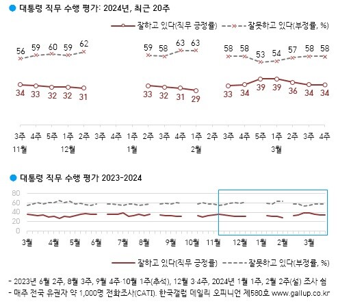 한국갤럽이 지난 26∼28일 전국 만 18세 이상 1천1명을 대상으로 조사(95% 신뢰수준에 표본오차 ±3.1%포인트)한 결과에 따르면 윤 대통령 직무 수행을 긍정 평가한 응답은 34%였다. 직전 조사와 같은 수치다.
