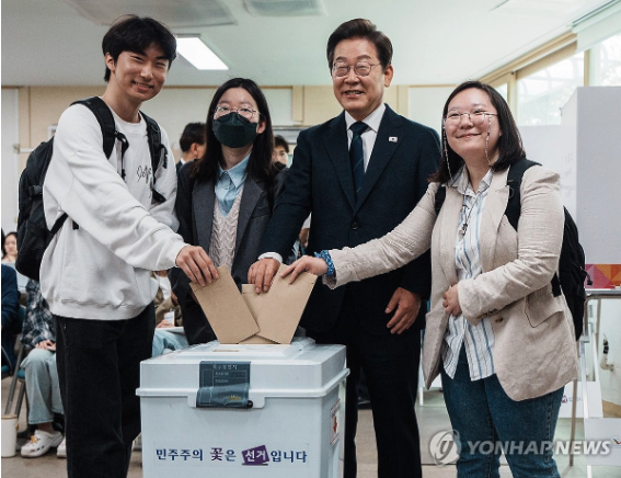 | ▲ 더불어민주당 이재명 대선 후보가 21대 대통령선거 사전투표 첫날인 29일 서울 서대문구 신촌동 주민센터에서 청년들과 투표하고 있다. 2025.5.29 (사진=연합뉴스) |