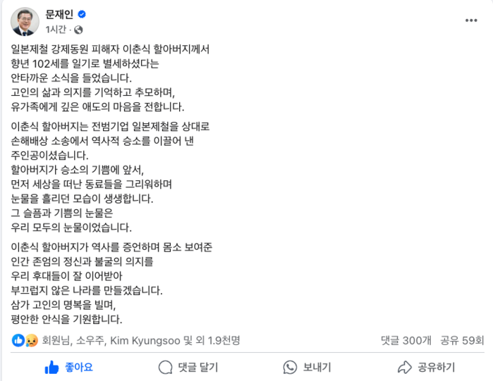 문 전 대통령은 28일 자신의 페이스북에서 “이춘식 할아버지는 전범 기업 일본제철을 상대로 손해배상 소송에서 역사적 승소를 이끌어낸 주인공”이라며 “고인의 삶과 의지를 기억하고 추모하며 유가족에게 깊은 애도의 마음을 전한다”고 전했다.