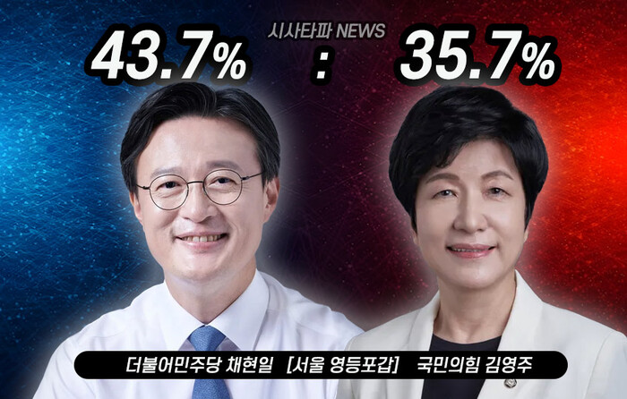 뉴스핌의 의뢰로 미디어리서치가 여론조사를 수행해 발표한 서울 영등포갑 가상대결 결과 채현일 더불어민주당 후보가 43.7%, 김영주 국민의힘 후보가 35.7%를 기록한 가운데 허은아 개혁신당 후보는 7.1%인 것으로 조사됐다.