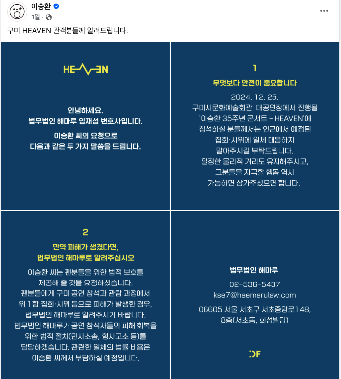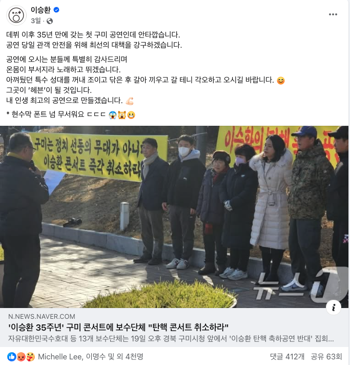 앞서 윤석열 대통령 탄핵에 공개 찬성한 가수 이승환은 구미 콘서트를 취소하라는 보수 우익단체의 요구를 받았다.