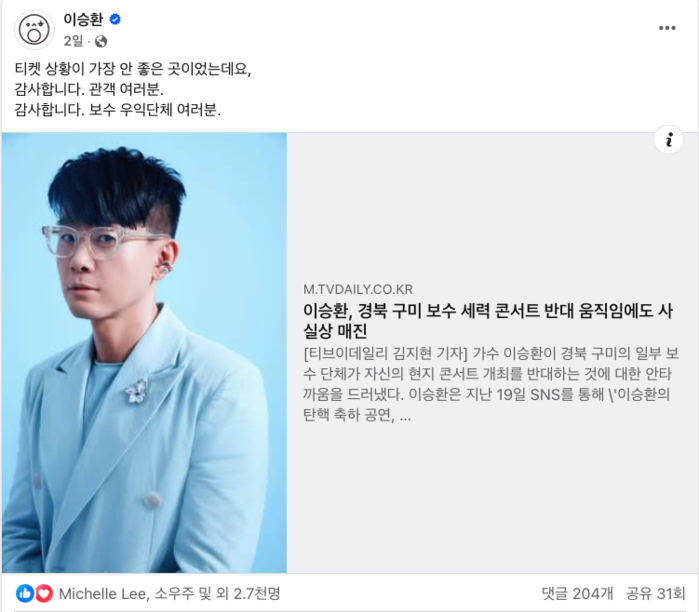 그는 지난 20일 구미시문화예술회관에서 열릴 콘서트가 사실상 매진이라며 "티켓 상황이 가장 안 좋은 곳이었는데요, 감사합니다. 관객 여러분. 보수 우익단체 여러분"이라는 글을 올렸다.